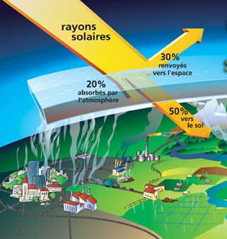 - reflecta 57% din radiatiile solare, mai ales din cele mai periculoase, si retin, ca intr-o sera, o buna parte din caldura acumulata de sol. Datorita acestui fenomen, planeta nu cunoaste diferente uriase de temperatura intre poli si Ecuator (diferenta maxima nu atinge1500 C), intre anotimpul rece si cel cald, sau intre noapte si zi in acelasi loc;