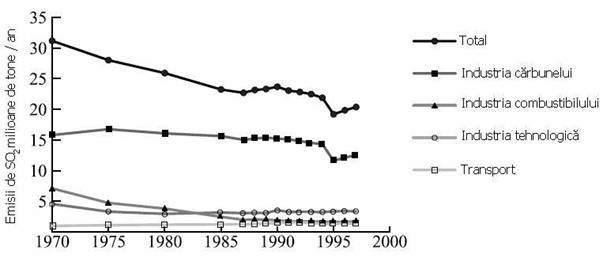 Cea mai mare parte din emisiile de sulf sunt generate de arderea carbunelui pentru a produce electricitate. O distribuție aproximativa a surselor ce genereaza SO2 este prezentata in Figura 1. Tendința descendenta a emisiilor de SO2, care este rezultatul incercarilor de a controla emisiile de SO2, este schițata in Figura 2. Declinul liniei de tendința inregistrat in 1995 a fost rezultatul implementarii Fazei I pentru controlul ploii acide care corespunde prevederilor Documentului IV din Prevederile Legii Aerului Curat.