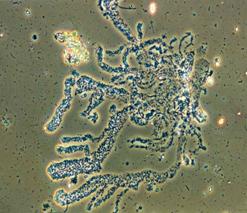 d) Bacterii filamentoase prezinta o componenta frecventa a flocoanelor de namol activat. Dezvoltarea excesiva a acestor bacterii formeaza o retea deasa de ochiuri in interiorul careia apa si aerul circula cu mare greutate ajungandu-se la o carenta de hrana si de oxigen care dauneaza si celorlalte microorganisme, cauzandu-le disparitia. Cand domina bacteriile filamentoase, eficienta de epurare exprimata in CCO si CBO5, este scazuta, iar biomasa nu decanteaza in clarificatorul final, se manifesta tendinta de plutire a namolului activ in decantoarele secundare. In namolul activ intalnim urmatoarele bacterii filamentoase : Sphaerotilus Natans - Fig 2.9 si Beggiatoa Alba - Fig.2.10.