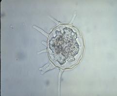 b) Ciliatele fixe apar in urma inmultirii ciliatelor libere marcand atingerea eficientei ridicate da epurare a apelor uzate, si stabilizarea biocenozei. Ele indica practice o epurare avansata a apelor uzate. Avem doua tipuri de ciliate fixe si anume : ciliate filtratoare dintre care amintim- Vorticella Microstoma, Vorticella Convallaria - Fig.2.23, Vorticella Silimis, Carchesium Polypinum, Opercularia Articulata etc., si ciliate rapitoare - suctorii - care se intalnesc mai rar in bazinele de aerare si aproape intotdeauna in exemplare izolate si sunt prezenti mai ales in instalatiile care lucreaza cu durate mari de aerare. Dintre acestia amintim : Acineta Grandis - Fig.2.24, Tocophrya Cyclopum, Tocophrya Infusionum, Podophrya Fixa, Sphaerophrys Sol etc.