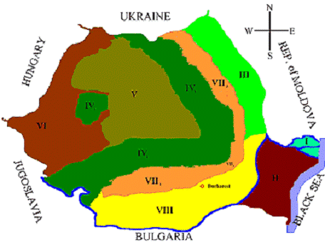 IV - Carpati (IV1 - Carpatii de Est; IV2 - Carpatii de Sud; IV3 - Carpatii de Vest, potential ridicat in biomasa, micro-hidro si eoliana);