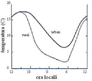 Cea mai mare diferenta de temperatura intre zona urbana si cea rurala este de obicei observata in timpul noptii. In localitati cu 1000 de locuitori, au fost masurate diferente de temperatura maxime de 2-3 grade Celsius, in timp ce pentru orase cu peste 1 milion de locuitori a fost masurat un exces de caldura pana la 8-12 grade Celsius (Oke, 1982).