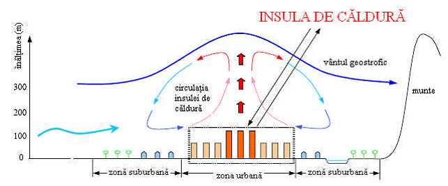Fenomenul cel mai frecvent observat este de crestere a temperaturii aerului fata de suprafetele urbane, fenomen care se cheama "insula de caldura". (heat island)