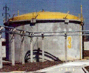 Rezervoarele de gaz din statiile existente (clopot metalic amplasat intr-o cuva de beton - Fig. 6) sunt de cele mai multe ori nefunctionale. Sistemul de culisare a clopotului la umplere si golire se blocheaza deseori iar clopotul se voaleaza. Remedierea este dificila, de durata si costisitoare.