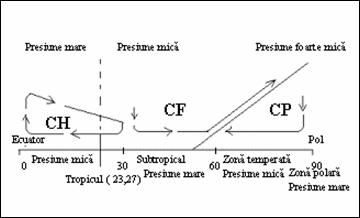 Se constata ca miscarile maselor de aer se realizeaza de la presiune mare la presiune mica. In zonele polare, aerul este rece si dens la suprafata Pamantului (presiune mare), iar la altitudinile mari este foarte rarefiat, presiunea fiind scazuta. Exista la latitudinea medie o zona de presiune mica, situata intre cele doua zone cu presiune mare (subtropicala si polara). Se vor crea doua circuite de aer de mica altitudine, spre zona temperata: unul de la marile presiuni polare si celalalt de la marile presiuni subtropicale, iar returul acestor circuite, de aer rece si respectiv de aer cald, care converg in zona temperata , se va face in directie oblica, datorita miscarii Pamantului.