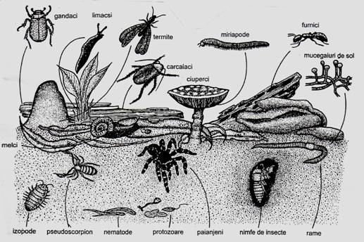 Fig. 1. O secventa de biocenoza de la nivelul pedofaunei si locul sau de trai = biotopul.