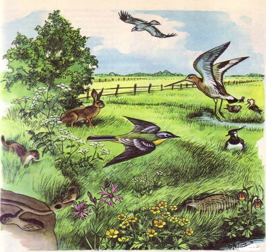 Fig. 5. Reprezentarea simplificata a celui de al 4-lea nivel de ierarhizare, ecosistemul. Aici - ecosistemul de pasune si fanate, aici reprezentat de speciile vegetale componente si totalitatea animalelor caracteristice (implicit cele din sol din categoria nevertebratelor mici sau a reprezentantilor regnurilor Monera si Protista)..