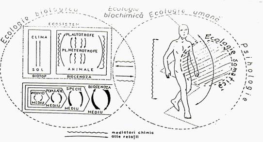 Fig. 7. Ecosistemul si semnificatia prezentei omului, in cadrul unui concept generalizat in ecologie, acela al relatiei complexe dintre ecologia biologica, ecologia umana si ecologia biochimica, ansamblul de factori principali care asigura circulatia substantei, energiei si informatiei in mediu..