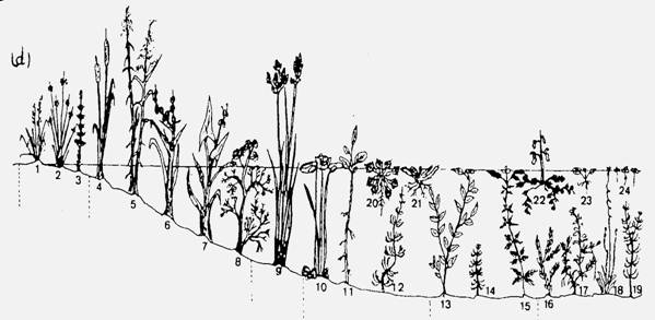 Fig. 9. Modele de stratificare pe orizontala a vegetatiei unui iaz (lac) (dupa Faurie si colab., 1998). 1- Carex riparia - rogoz; 2 - Juncus sp. - pipirig; 3 - Equisetum sp. - coada calului; 4 - Typha latifolia - papura; 5 - Phragmittes communis - trestie, stuf; 6 - Sparganium ramosum - sovar; 7 - Sagittalia sagitifolia - sageata apei; 8 - Ranunculus sp. - piciorul cocosului; 9 - Scirpus sp. - tipirig; 10 - Nymphaea alba - nufar; 11 - Polygonum sp.; 12 - Ceratophyllum sp. ; 13 - Potamogeton lucens - broasca apei; 14 - Hippuris sp. ; 15 - Myriophyllum spicatum - penita; 16 - Fontinale; 17 - Helodea sp. - ciuma apei; 18 - Vallisneria spicalis - orzoaica-de-apa; 19 - Chara sp.; 20 - Trapa natans - castan de apa, coltan, cornaci; 21 - Stratiotes aloides - foarfeca baltii; 22 - Utricularia vulgaris - otratel de apa; 23 - Hydrocaris sp. ; 24 - Lemna sp. - lintita.