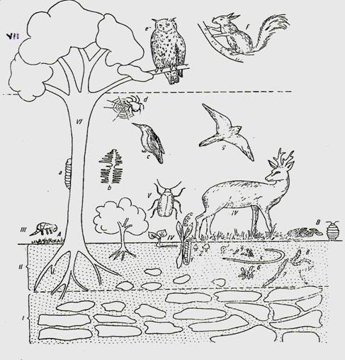 Fig. 10. Stratificarea pe verticala la nivelul unei paduri. Straturile de vegetati si de la nivelul solului sunt insotite de o stratificare si a reprezentantilor celorlalte regnuri ale viului. I - stratul hipogeu mineral; II - stratul hipogeu organic al solului (dupa Stugren, 1965) (1 - larve de insecte; 2 - ciuperci; 3 - micromicete; 4 - bacterii; 5 - enchitreide si nematode; 6 - protozoare; 7 - lumbricide; 8 - miriapode); III - stratul epigeu inframuscinal = patoma (constituit din muschi si licheni; A - colembole; B - izopode); IV - stratul ierbos de talie mica (specii de plante de talie mica; specii de animale vertebrate care traiesc numai pe sol; ex. caprioara); V - stratul ierbos de talie inalta si arbustiv (include si speciile de insecte si pasari ce zboara la acest nivel); VI - stratul arboricol; VII - coronamentul (e, f - specii de animale caracteristice ca mediu de viata pentru acest nivel)
