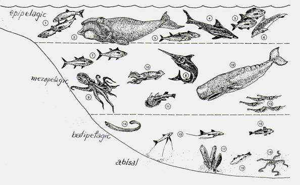 Fig. 1 "Stratificarea" pe verticala a megafaunei de la nivelul oceanelor.