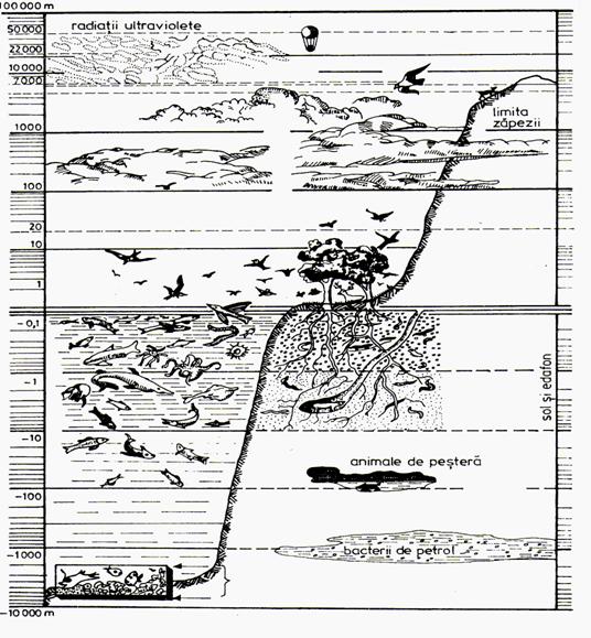 Fig. 13. Limitele biosferei. Biota se "aglomereaza" la limita spatiului vital unde se realizeaza contactul dintre cele 3 sfere esentiale (atmosfera, litosfera si hidrosfera) si se diminueaza treptat cu cat ne indepartam, in ambele sensuri, de acest spatiu.