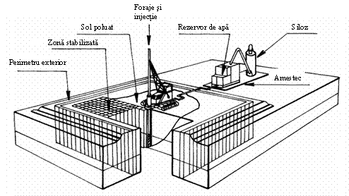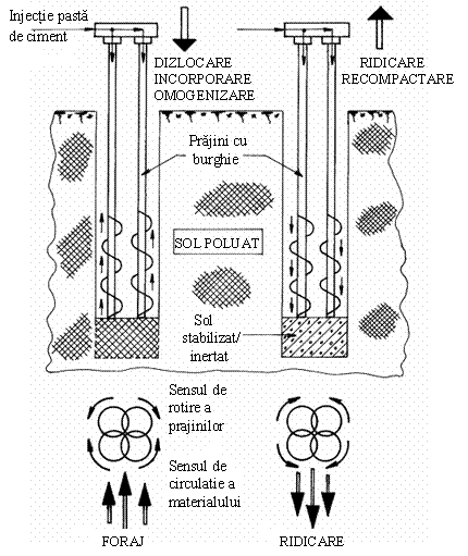 incorporarea in masa de sol contaminat a pastei de liant (ciment, var etc), care este injectata axial prin prajinele de foraj;