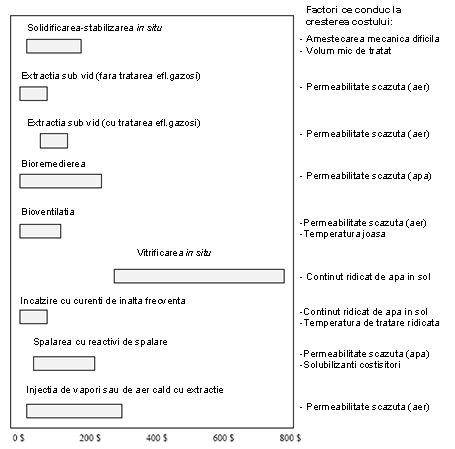 In figura 4 este prezentata o sinteza care permite compararea din punct de vedere al costului a diferitelor procedee de depoluare a zonei nesaturate aplicabile in situ: solidificarea/inertarea, extractia sub vid (fara tratarea efluentilor gazosi), extractia sub vid (cu tratarea efluentilor gazosi), bioremedierea, bioventilatia, vitrificarea in situ, incalzirea electrica, spalarea cu reactivi de spalare si injectia de vapori sau aer cald cu extractie.