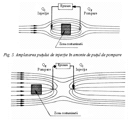 Reintroducerea apei subterane in acvifer, prin amplasarea putului de injectie in aval de putul de pompare (fig. 6), permite blocarea hidraulica a poluantilor prin inversarea locala a sensului de curgere a apei subterane.