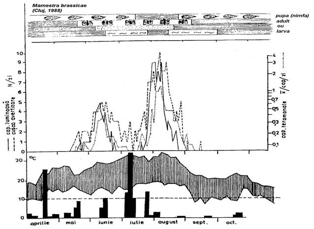 Fig. 5-22. Bioclimograma speciei Mamestra brassicae in zona Cluj (1988) (dupa Stan 1990; Stan si colab. 1992).