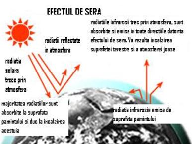 Unele gaze din atmosfera (vaporii de apa, bioxidul de carbon, ozonul, metanul, bioxidul de azot si unele tipuri de CFC) impiedica disiparea caldurii produsa de pamint in spatiu