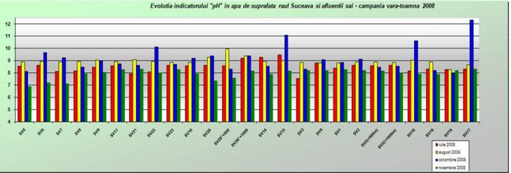 masurarile din luna octombrie pun in evidenta valori ridicate ale nivelului pH-ului in sectiunile de control SV6(paraul Pozen amonte de orasul Radauti), SV22(raul Suceava aval de confluent cu paaul Solonet), SV15(Itcani), SV16(Tisauti) siSV17(Liteni) unde s-a inregistrat valoarea maxima, respectiv 12,3 unit. pH;