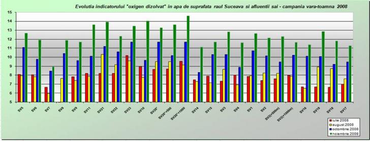 evolutia acestui indicator de calitate prezinta fluctuatii sezoniere in sectiune de control de pe paraul Solonet (SV10 si SV26), in sectiunile de control de pe raul Suceava situate amonte si aval de confluenta cu Solonetul, precum si in sectiunile Veresti (de pe raul Suceava) si Salcea (paraul omonim); in ultima sectiune de control s-a inregistrat in luna iulie valoarea maxima de 12,12mg/l;