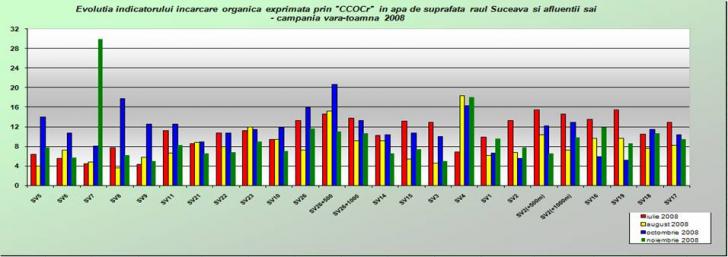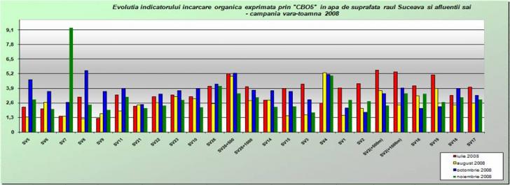 valoarea maxima de 29,9 mgO2/l s-a inregistrat in sectiunea de control SV7(paraul Pozen aval de orasul Radauti) ca urmare a deversarilor de ape menajere din orasul Radauti.O situatie similara se inregistreaza in sectiunea de control SV4 de pe raul Suceava unde valorile ridicate ale acestui indicator pun in evidenta aportul de ape menajere neepurate ce sunt deversate in aceasta zona. Valorile ridicate se mentin si aval de depozitul de deseuri al municipiului Suceava ca urmare a deversarilor de apa uzate de pe malul stang provenite de la statia de epurare a orasului la care se adauga si influenta depozitului de deseuri.