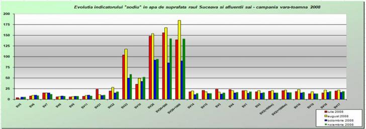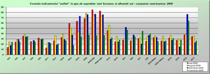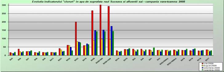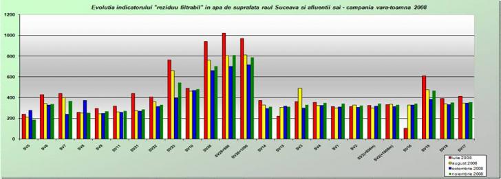 se constata valori ridicate in sectiunile: SV7 paraul Pozen aval de Radauti, SV11 raul Suceava la Milisauti, SV4, SV1, SV2, SV2+500 si +1000m situate in zona de influenta a Depozitului de deseuri al orasului Suceava si a deversarilor de ape uzate din aceasta zona, SV16 Tisauti, SV18 Veresti si SV17 Liteni; cele mai mari valori s-au inregistrat in luna august.