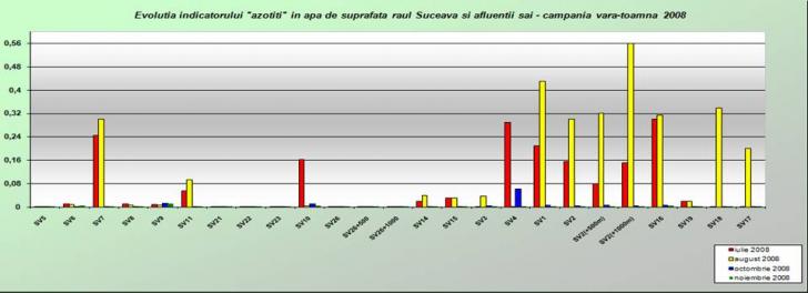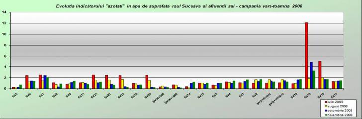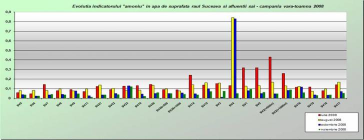 evolutia acestui indicator de calitate prezinta fluctuatii similare cu cele ale indicatorului de calitate fosfati, respectiv valori maxime in sectiunea SV4 unde se resimte puternic influenta deversarilor de ape uzate din municipiul Suceava, precum si in sectiunile de control situate in aval;