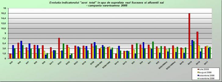 Fig. 12. Evolutia indicatorului "azot total" apa de suprafata raul Suceava si afluentii sai in cadrul campaniei vara - toamna