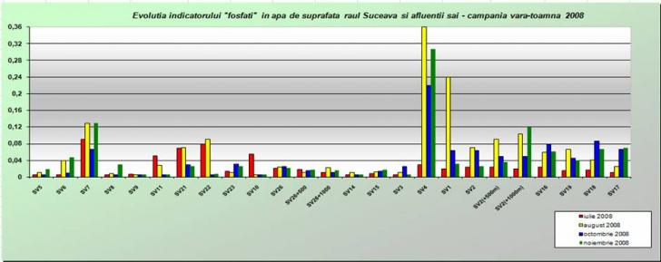 Fig. 13. Evolutia indicatorului "fosfati" apa de suprafata raul Suceava si afluentii sai in cadrul campaniei vara - toamna