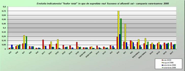 Fig.14. Evolutia indicatorului "fosfor total" apa de suprafata raul Suceava si afluentii sai in cadrul campaniei vara - toamna