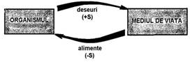c. Principiul lui Schrdinger. Schimbul de substanta si energie se realizeaza intre organisme si mediu. Din moment ce o biocenoza am vazut ca nu evolueaza spre starea de entropie maxima, se poate deduce ca tocmai la nivelul organismului actioneaza unele mecanisme suplimentare care nu se incadreaza nici la principiul II al termodinamicii si nici la principiul lui Boltzmann. Dupa Schrdinger (1944) organismul schimba cu mediul substanta, energie si entropie, sau "organismele se hranesc cu entropie negativa" (are loc un schimb de entropie, prin eliminarea entropiei pozitive, a dezordinii, si acceptarea de entropie negativa din mediu, adica ordine). Entropia negativa este diferenta dintre entropia alimentelor (input) si entropia produselor degradate (output). Gradul de dezorganizare a produsilor de excretie (excrementelor) este mai mare decat gradul de dezorganizare a alimentelor si de aceea diferenta are semnul negativ (Fig. 6-13). Deci organismul elimina dezordine si acumuleaza ordine (entropie negativa).
