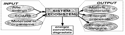 Fig. 7-1. Modelul unui sistem deschis de tip ecosistem cu evidentierea relatiei dintre input si output (dupa Odum 1993)