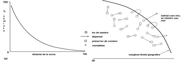 Modelul general de dispersie a fost prezentat de Kettle (1951) (Fig. 4-2, a). Cu cat distanta fata de spatiul-casa creste scade procentajul de dispersie a semintelor unei plante (trendul curbei care ilustreaza modelul este reprezentat de ecuatia - Y = a ebx; Y = numarul de seminte sau alte unitati dispersabile; x = distanta; a = numarul de seminte la sursa unde distanta = 0; e = baza logaritmului natural).