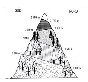 Fig. 7-47. Variatia altitudinii etajelor de vegetatie in munti in functie de expozitia versantilor (dupa Faurie et al. 1998).
