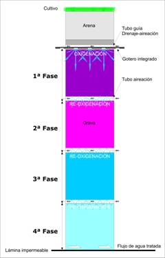 Apa reziduala ajunge prin intermediul unei retele de emitatori subterani, instalati in interiorul unor conducte ranurate, deasupra pietrisului, pentru a produce percolarea apei prin acesta. Odata atinsa baza impermeabila, apa reziduala, deja epurata, se scurge, datorita gravitatiei, catre punctele de varsare, inmagazinare sau pompare, in vederea reutilizarii ei pe alte suprafete.