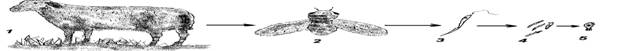 Fig. 6-41. Lantul trofic parazitic (dupa Stugren 1965). 1 - oaie; 2 - dipter, insecte; 3 - protozoar parazit; 4 - bacterie; 5 - bacteriofag.