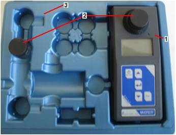 1 – turbidimetru portabil; 2 – cuve de masurare; 3 – geanta de transport.
