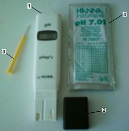 1 – pH-metru; 2 – capac protector; 3 – surubelnita de calibrare; 4 – solutii etalon.