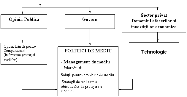 Politica de mediu trebuie sa includa obiectivele care asigura dezvoltarea SSE si SSU dar trebuie sa includa si premisele de mentinere a capitalului natural (structural si functional) la un nivel care sa poata sustine aceasta dezvoltare; aceasta are la baza existenta unei "interactiuni" intre stiintele ecologie si dezvoltare economica, abordarea problemelor de mediu se realizeaza in ordinea obiectivelor "tinta" iar indeplinirea acestor obiective raspunde nevoilor actuale locale (particulare) si globale (in limita realizarii lor la nivel local) avandu-se in vedere schimbarea comportamentului uman renuntandu-se la viziunea antropocentrista in favoarea celei ecocentriste (Ecosfera nu reprezinta "un rezervor urias" si mai cu seama nu este inert la presiunile antropice de orice natura ar fi acestea).