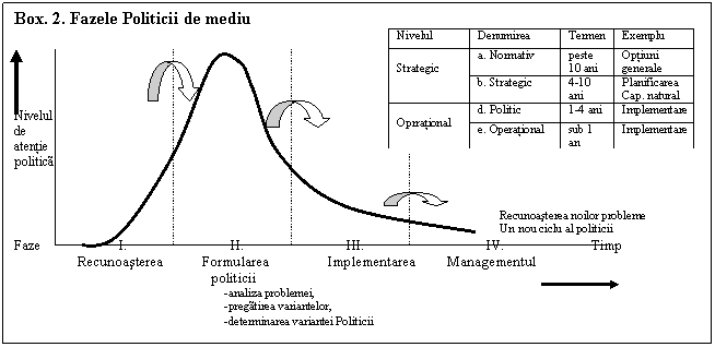 Politica de mediu trebuie sa implice o abordare holistica si presupune parcurgerea unor faze ale ciclului sau de viata (in numar de 4, faza a 2 a fiind subimpartita in 3 etape, Box. 2.) desi relative sunt foarte importante (de exemplu ceea ce este strategic pentru nivelul local-comunitar sau pentru o firma sau alta poate sa fie pentru Ministerul Mediului de un nuvel mai inferior al importantei).