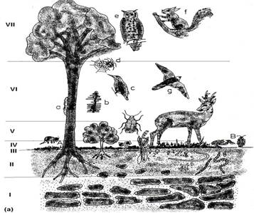 Fig. 7-5. Stratificarea pe verticala a ecosistemului, la nivelul unei paduri, caracter imprimat de vegetatie dar implicand si specii reprezentative ale faunei. I - stratul mineral al solului; II - stratul organic al solului; III - patoma; IV - stratul ierburilor mici; V - strat de arbusti si tufe; VI - stratul tulpinilor (arboretul); VII - coronamentul (dupa Stugren 1994).