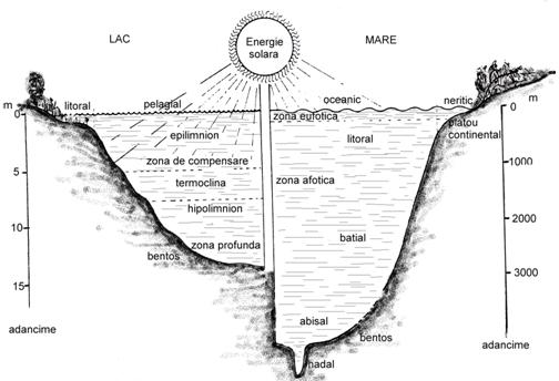 O stratificarea pe verticala, similara, exista la nivelul unui ecosistem acvatic de ape interioare, lentic (lac) (Fig. 7-7).