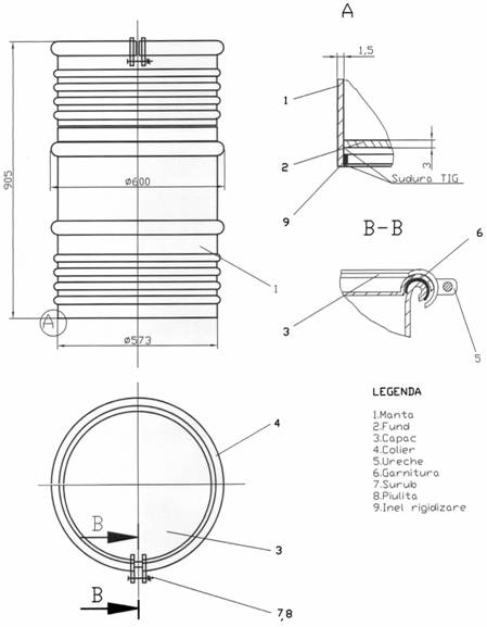 Pentru depozitarea temporara a deseurilor radioactive solide slab active compactate de la CNE Prod Cernavoda, este utilizat drept container de tip A, butoiul din inox de 220 l cu dimensiunile ce se dau in figura 5.3.1.