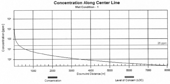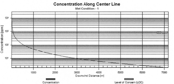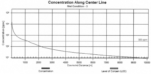 In graficul urmator se prezinta evolutia concentratiei amoniacului in aer functie de distanta de sursa de emisie iar zonele afectate sunt prezentate grafic in Anexa IVBIV 2.