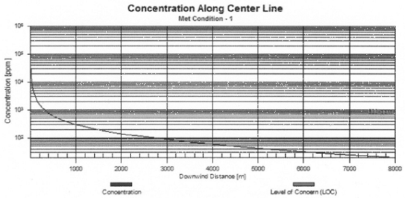 Zona afectata de concentratii letale (peste LC50) se intinde pana la cca 16 m iar pragul IDLH este atins intr-o zona cu raza cercului de 364 m.