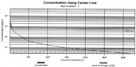 In graficul urmator se prezinta evolutia concentratiei amoniacului in aer functie de distanta de sursa de emisie iar zonele afectate sunt prezentate grafic in Anexa IVBIV 1a