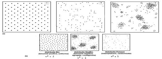 Exista 3 moduri de distributie a populatiilor (indivizilor) in spatiu: - la intamplare (Poisson, hazard, randomizat); - uniform (BIN, binomial pozitiva); - agregate (NEGBIN, binomial negativa, aglomerat, contagios) (Fig. 5-19).
