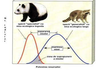 Atunci cand resursele din mediu sunt delimitate relativ precis si sunt repartizate pe specii, apare o delimitare relativ-distincta dintre nise (nu este o delimitare neta deoarece nisele se suprapun pe anumite suprafete). Realizarea acestui model determina evidente interactiuni dintre specii ceea ce poate duce la eliminarea unora dintre ele. Intre suprapunerea niselor si numarul de specii care sunt implicate exista o relatie care urmeaza legea tolerantei si se exprima printr-o curba sub forma de clopot. Nisele ecologice pot coexista in conditiile existentei mai multor specii, deoarece pot interveni mecanisme diferite care asigura aceasta coexistenta (exploatarea diferita, in spatiu si timp, a resurselor trofice din spatiul respectiv, numar diferit de specii, numar diferit de indivizi/specie etc) (Fig. 6-18, a).