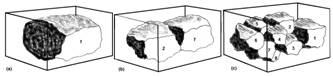 Fig. 6-16. Un model abstractizat de reprezentare a spatiului de nisa (spatiu ecologic) ca un hipervolum. (a) - hipervolum ocupat de o singura specie; (b) - hipervolum ocupat de 2 specii; (c) - hipervolum ocupat de mai multe specii (dupa Smith 1974).