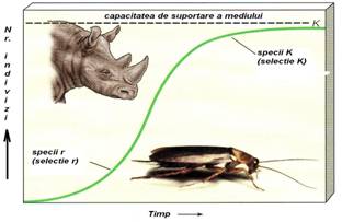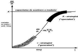 In curba cresterii logistice (Fig. 6-20), cu relatia matematica reprezentativa exista 3 parametrii importanti: N = numarul de indivizi sau biomasa la un moment dat t; r = rata (coeficientul) de crestere; K = numarul maxim de indivizi pe care poate sa-i suporte un biotop, corelat cu resursele sale. Pe baza parametrilor r si K s-a definit strategia r-K. Particularitatile speciilor incluse in cele doua categorii sunt sintetic prezentate in Tabelul 12.