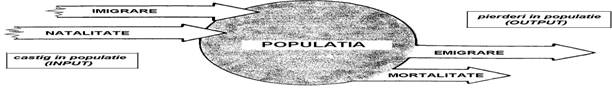 Indivizii pot intra intr-o populatie prin imigrare sau datorita fenomenului de nastere si parasesc populatia prin mortalitate si emigrare (Fig. 5-23). Daca populatia nu se schimba prin emigrari si imigrari atunci dinamica sa este caracterizata de urmatorii parametrii: rata natalitatii, rata mortalitatii, rata cresterii numerice si ecuatia de crestere.